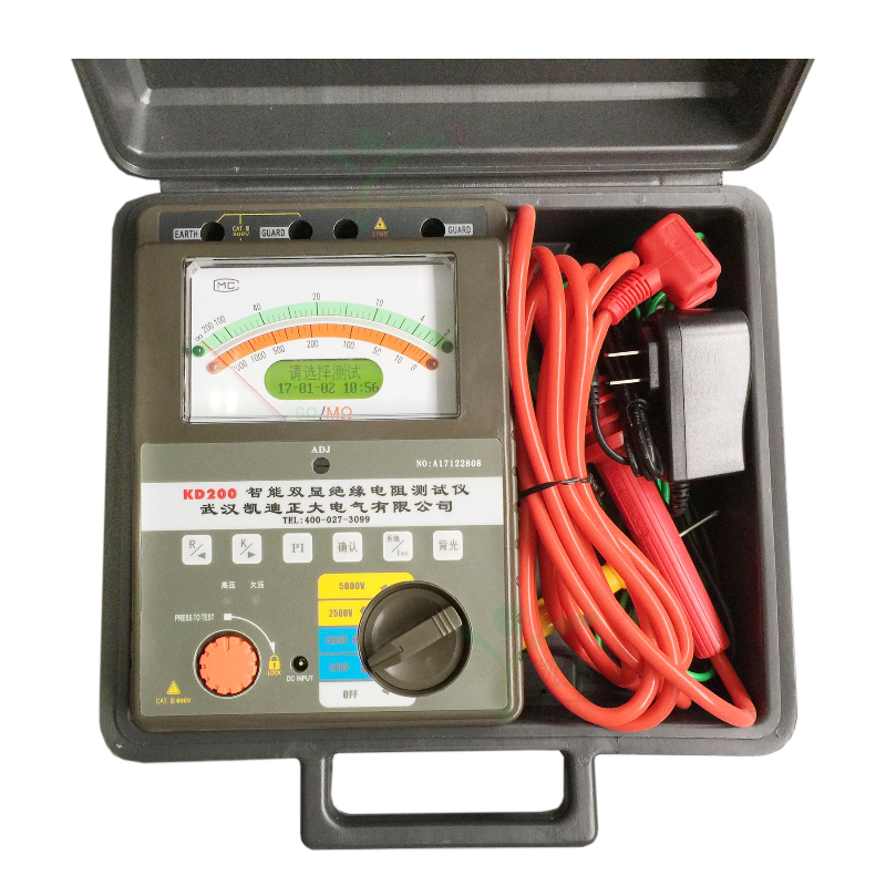 武漢凱迪正大電氣有限公司專業(yè)生產(chǎn)的KD200系列型智能雙顯絕緣電阻測試儀采用嵌入式工業(yè)單片機實時操作系統(tǒng),薄形張絲表頭與圖形點陣液晶顯示器較好結(jié)合,KD200系列表具有多種電壓輸出等級(500V、1000V、2500V、5000V)、容量大、抗干擾強、指針與數(shù)字同步顯示、交直流兩用、操作簡單、自動計算各種絕緣指標(biāo)(吸收比、極化指數(shù))、各種測量結(jié)果具有防掉電功能等特點。是測量大容量變壓器、互感器、發(fā)電機、高壓電動機、電力電容、電力電纜、避雷器等絕緣電阻的測試儀器。