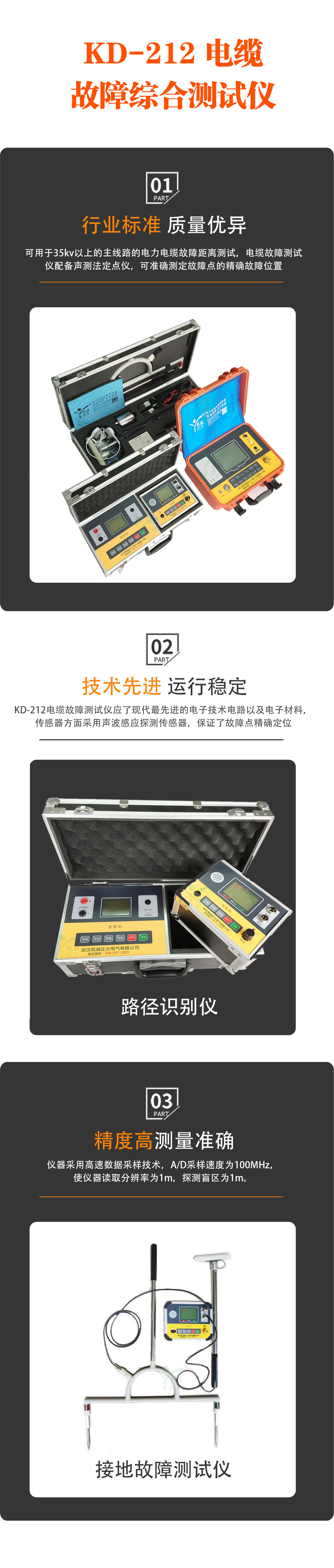 KD-212電纜故障測(cè)試儀能對(duì)地埋電力電纜故障、礦用電纜故障、通訊通信電纜故障、路燈電纜故障、高低壓電纜故障、直埋電纜故障、架空電纜故障中的開(kāi)路、短路、閃絡(luò)放電故障、高阻泄漏故障、高阻閃絡(luò)故障,高低阻性的接地觸不良等故障進(jìn)行綜合分析檢測(cè)。能對(duì)電纜故障點(diǎn)進(jìn)行行波測(cè)量法、低壓脈沖法、脈沖電流法(直閃法、沖閃法)、弧反射法準(zhǔn)確查找、定位等。是國(guó)內(nèi)比較可靠的便攜數(shù)字式電纜故障綜合分析檢測(cè)儀器。電纜故障測(cè)試儀可用于35kv以上的主線路的故障距離測(cè)試,該電纜故障測(cè)試儀適用于測(cè)試各種型號(hào)、不同等級(jí)電壓的電力電纜及通信電纜。