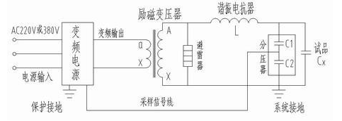 我們已知,在回路頻率f=1/2π√LC時,回路產生諧振,此時試品上的電壓是勵磁變高壓端輸出電壓的Q倍,Q為系統品質因素,即電壓諧振倍數,一般為幾十到一百以上。先通過調節變頻電源的輸出頻率使回路發生串聯諧振。再在回路諧振的條件下調節變頻電源輸出電壓使試品電壓達到試驗值,由于回路的諧振,變頻電源較小的輸出電壓就可在試品CX上產生較高的試驗電壓。
