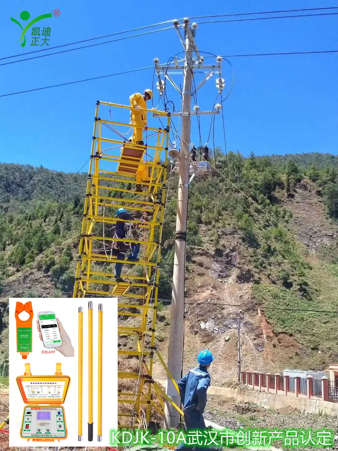 首先將故障線(xiàn)路的開(kāi)關(guān)斷開(kāi);使用KDJK-10A測(cè)試地線(xiàn)用接地線(xiàn)與接地棒連接,接地棒接入大地網(wǎng);信號(hào)輸出端子與高壓輸出測(cè)試線(xiàn)插頭端子連接,其另一端的線(xiàn)鼻子壓擰在接在絕緣掛線(xiàn)桿的蝴蝶母接線(xiàn)柱上,3根絕緣桿用短接線(xiàn)連接,再將掛線(xiàn)桿掛在故障線(xiàn)路上。