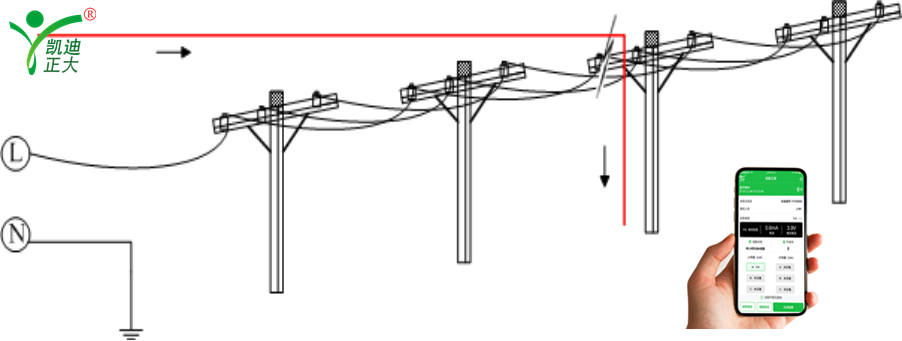 1.1.1定點(diǎn):當(dāng)確定故障區(qū)段后,主機(jī)輸出的信號(hào)將沿線(xiàn)路經(jīng)故障點(diǎn)流入大地(如下圖),根據(jù)此特點(diǎn)即可采用二分法進(jìn)一步定位故障。