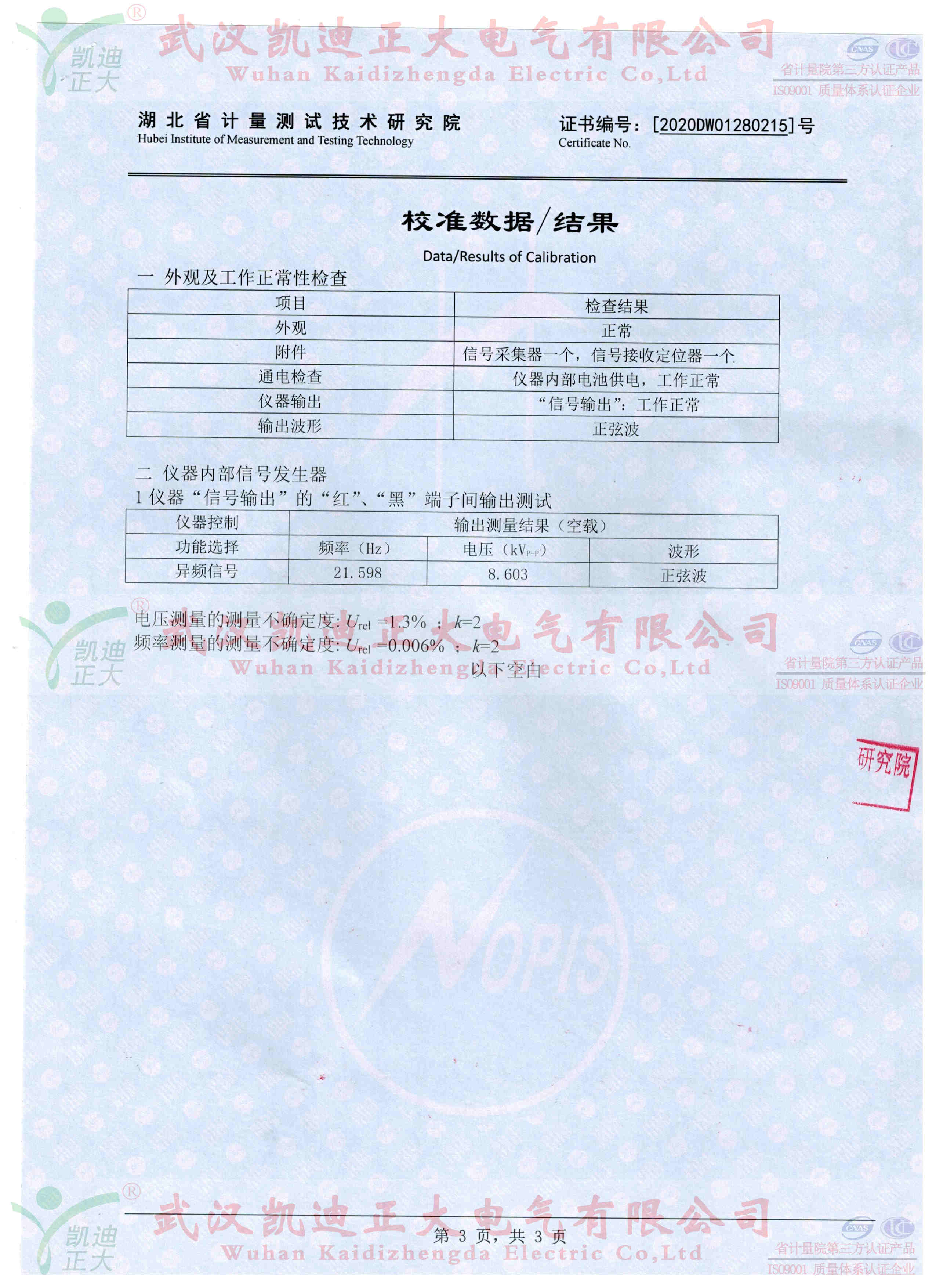 我司抽檢10套10kV配網單相接地故障定位儀送往湖北省計量測試技術研究院校準,獲得電學所檢測設備DS0S054A數字示波器標準設備的數據:輸出波形正玄波、異頻信號21.598Hz、輸出電壓8.603kV、頻率測量的不確定度0.006%。符合武漢凱迪正大公司和國家電力規程標準。