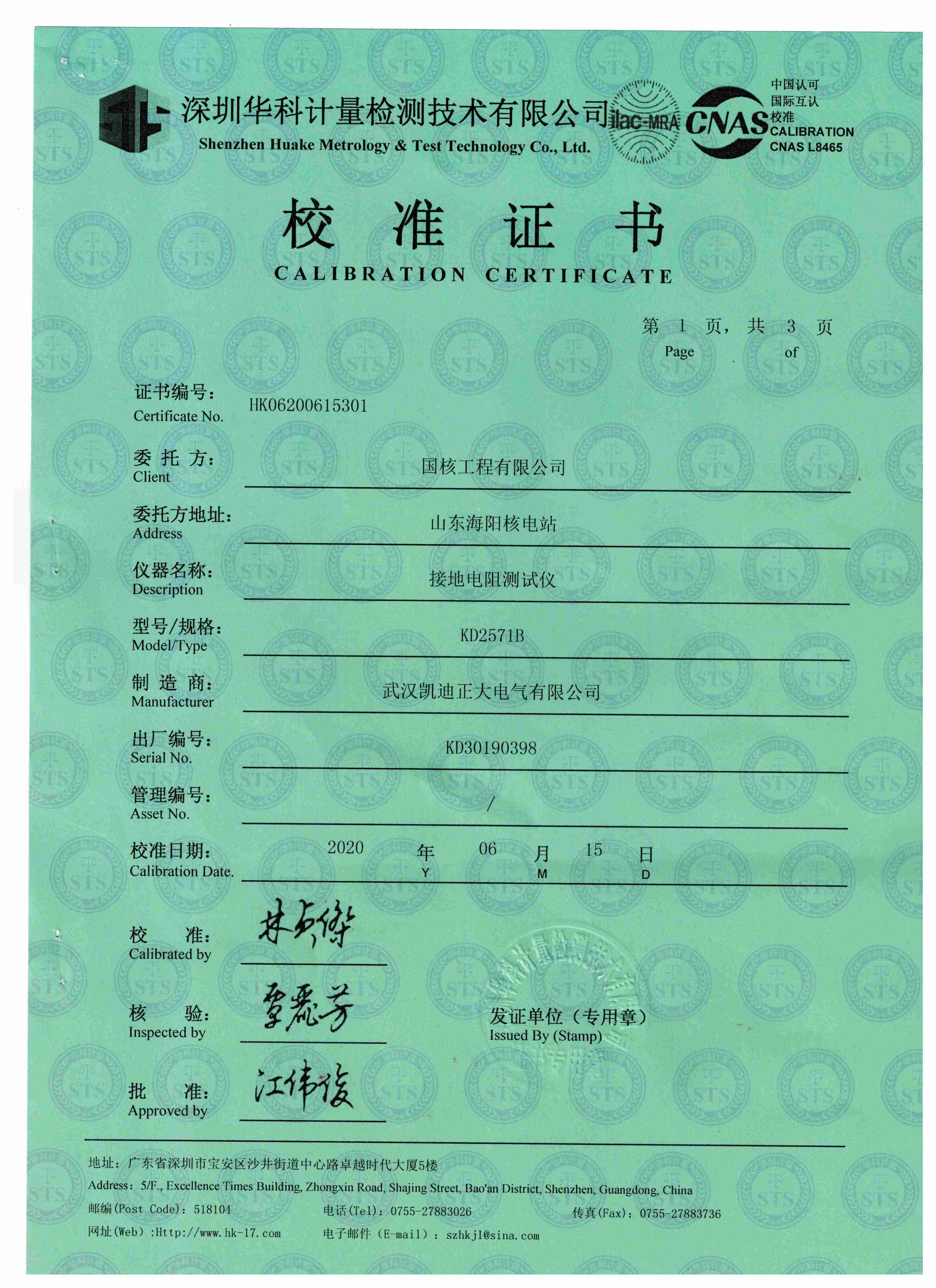 海陽核電購置KD2571B接地電阻測試儀獲得校準證書