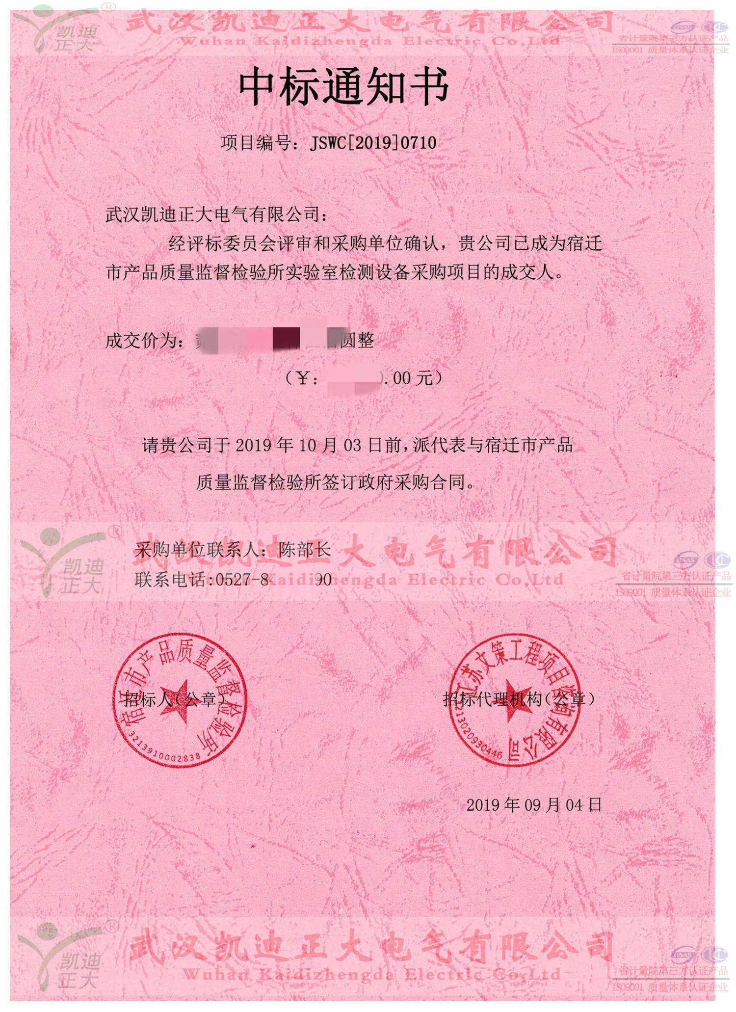 2019年9月份,受邀參與隸屬于宿遷市質(zhì)量技術(shù)監(jiān)督局的宿遷市產(chǎn)品質(zhì)量監(jiān)督檢驗(yàn)所實(shí)驗(yàn)室檢測(cè)設(shè)備采購項(xiàng)目,并以最高分獲得中標(biāo)人。因武漢疫情等影響昨日收到宿遷質(zhì)檢所的中標(biāo)通知書。