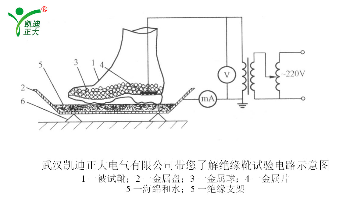 將一個與試樣鞋號一致的金屬片為內電極放人鞋內,金屬片上鋪滿直徑不大于4mm的金屬球,其高度不小于15mm,外接導線焊一片直徑大于4mm的銅片,并埋入金屬球內。外電極為置于金屬器內的浸水海棉,試驗電路見圖。