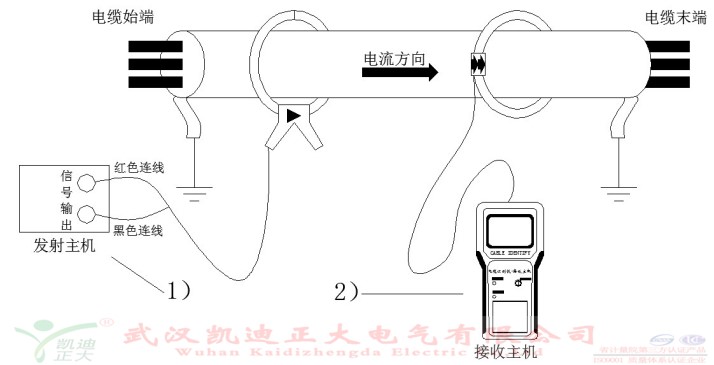 1)發射主機準備:將卡鉗卡入電纜,接線柱按顏色接入發射主機,開關置于“帶電識別”檔位,“輸出指示”閃亮則輸出正常;