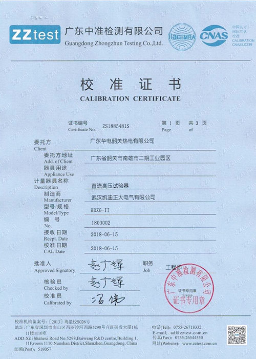武漢凱迪正大KDZG--II直流高壓試驗器校準證書