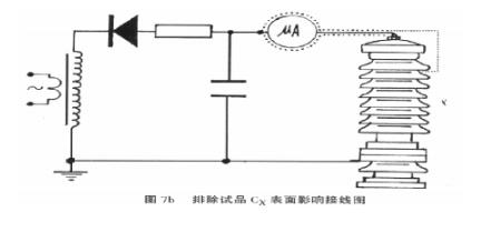 b.微安表須有金屬屏蔽,應采用屏蔽線與試品聯接。高壓引線的屏蔽引出應與儀表端的屏蔽緊密聯接。如果試品表面污穢要排除試品表面泄漏電流的影響可在試品高電位端用裸金屬軟線緊密繞幾圈后與高壓引線的屏蔽相聯接(見下圖)。