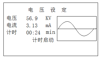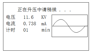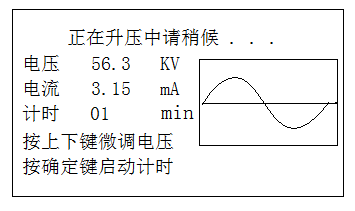 自檢成功后,儀器自動進入升壓狀態。儀器將用若干個周期的時間(幾分鐘)將電壓升至設定值。在升壓過程中,按停機鍵,儀器將切斷電壓輸出,回到開始畫面。當升壓值接近設定值時出現圖7