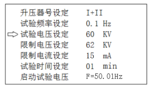 1. 升壓器號設定:如果使用I號升壓器單獨升壓,升壓器號設定為I號(此時試驗電壓設定≤30KV),如果使用I號升壓器和II號升壓器串聯升壓,升壓器號設定為I+II號。