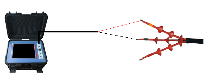 先將雙夾測試線接至(預定位儀后側板)采樣端口,再將測試線的紅夾子夾在電纜的一個好相,黑夾子夾在電纜的另一個好相。