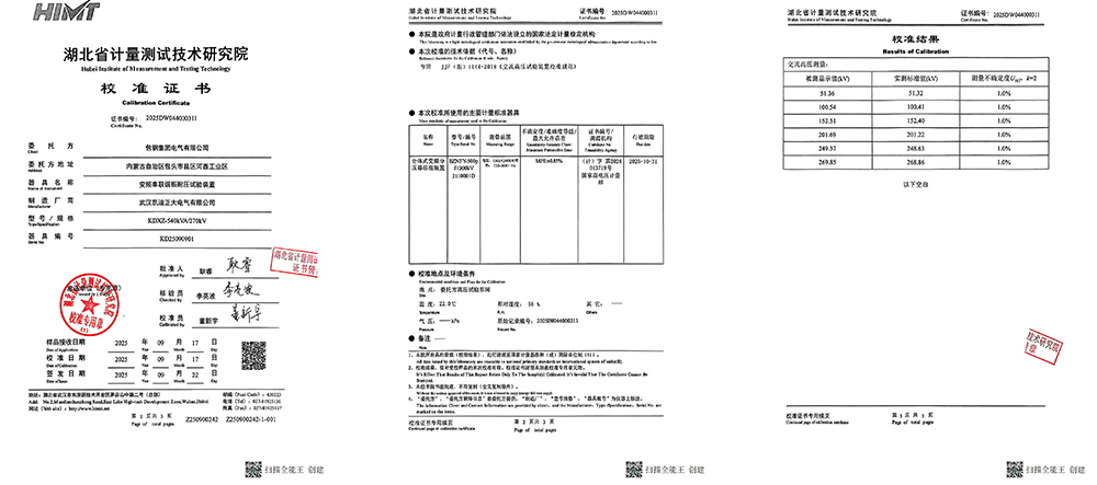 本次校準(zhǔn)由湖北省計量測試技術(shù)研究院執(zhí)行,該校是政府依法設(shè)立的法定計量檢定機(jī)構(gòu),具備國家認(rèn)可的校準(zhǔn)資質(zhì)與溯源能力。校準(zhǔn)過程嚴(yán)格依據(jù)JJF(浙)1144-2018《交流高壓試驗裝置校準(zhǔn)規(guī)范》進(jìn)行,確保了技術(shù)方法的規(guī)范性與結(jié)果的可比性。